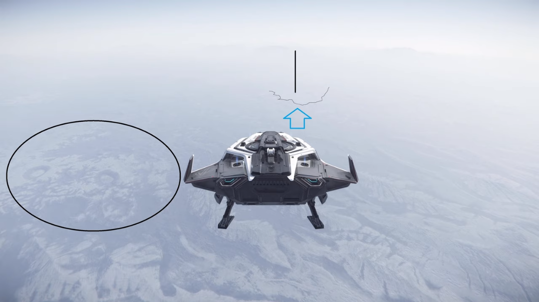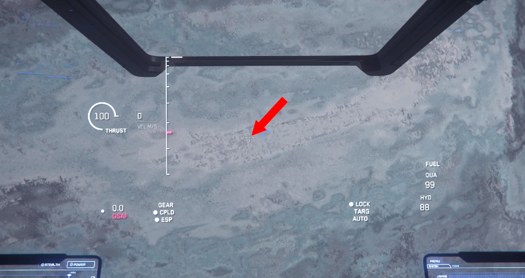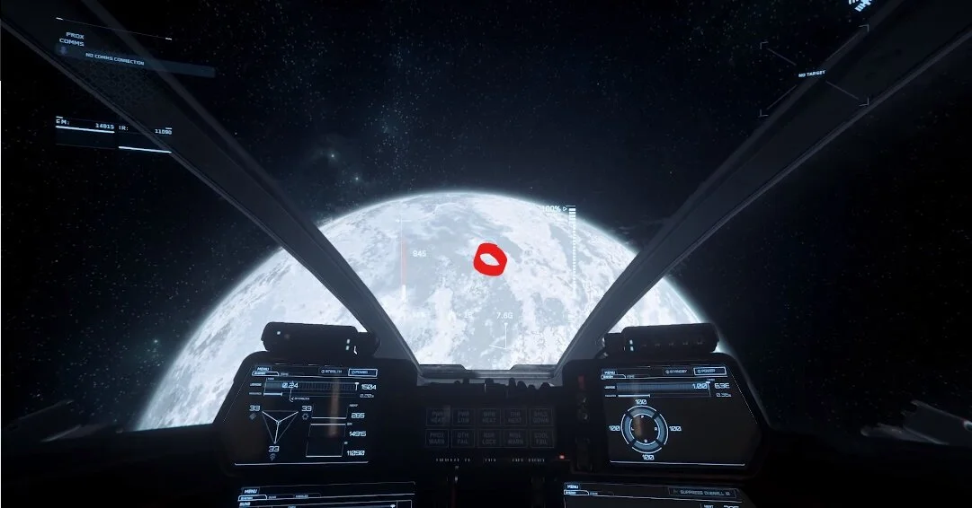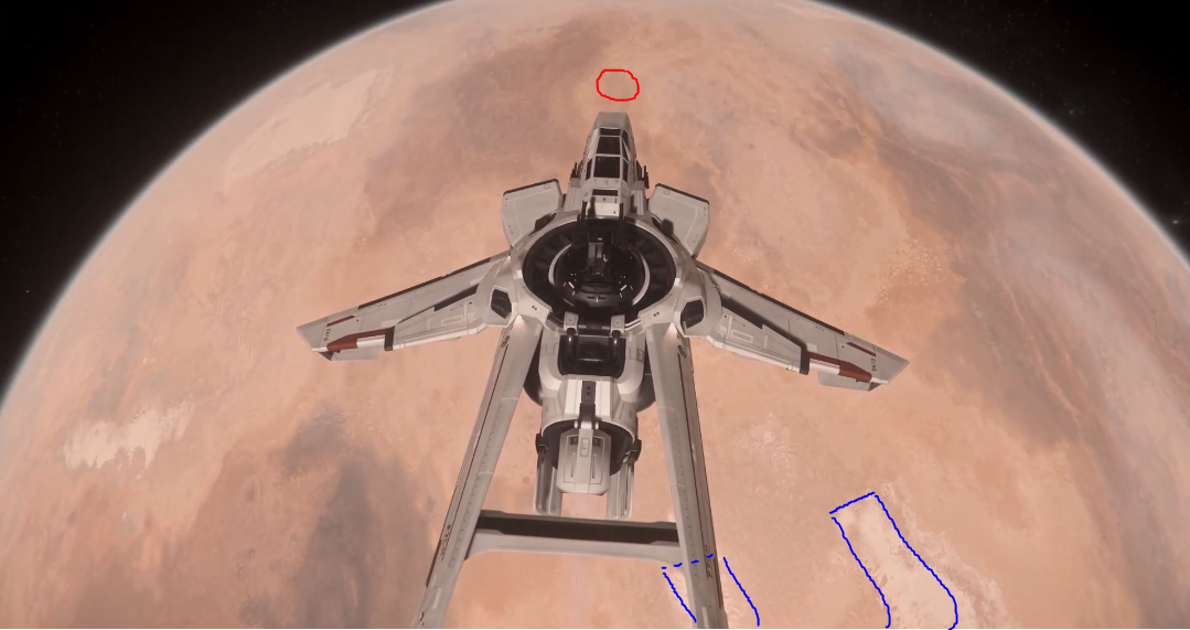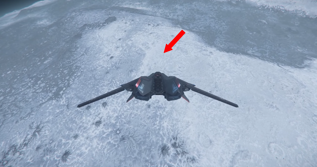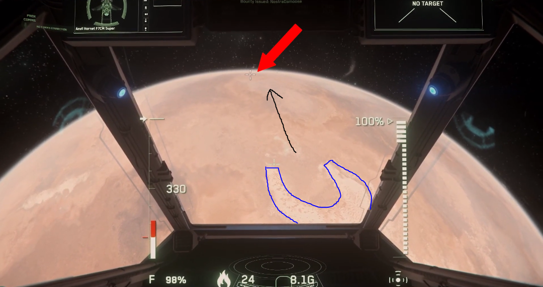 To begin, travel to Daymar and quantum to Wolf Point Aid Shelter. Once you exit quantum, point your ship at 90 degrees and accelerate until you exit Daymar’s atmosphere. Flip your ship around and locate the lighter coloured terrain resembling a “U”. This “U” shape happens to point towards the location, see the image below for clarification.