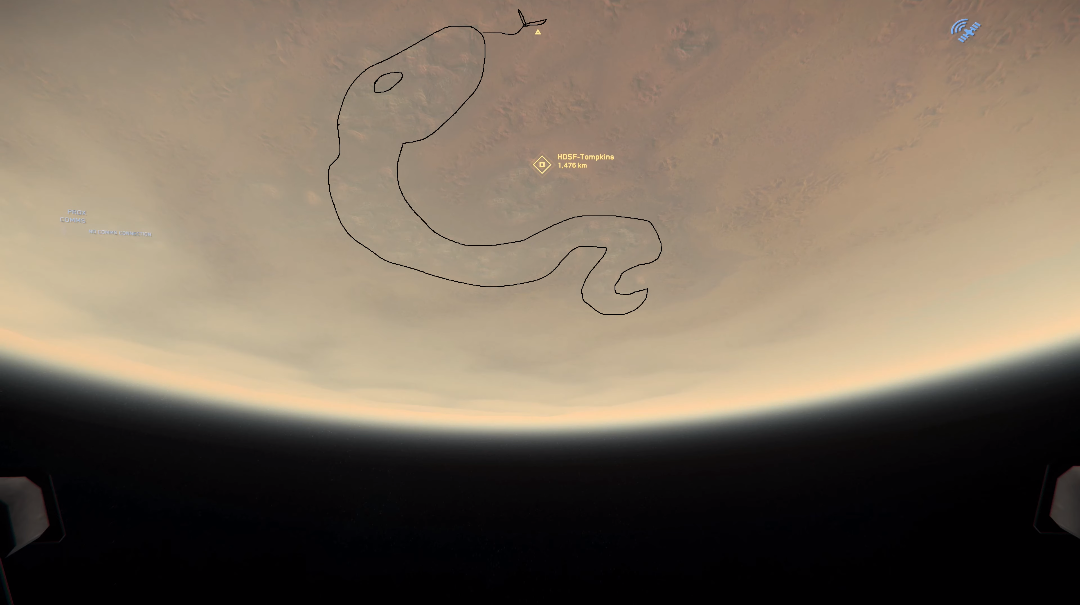 In order get to the Orinth Scrapyard without accepting the mission, you will first need to make your way to OM-4. Once there, jump back to Hurston. From there locate the outpost marker “HDSF-Tompkins”, spool up and jump to this marker however, make sure to keep an eye on the marker when in quantum as when you are in the 600km range from the marker, cut your ships power to exit quantum state. You will know if you have succeeded if you see a snake shaped mountain range, see the left-most image below for clarification. Realign you ship and identify the snake’s head, you should see two sets of mountains on the left side of the snake’s head. The mountain furthest from the snake’s head is where the location is situated (see middle image below). More specifically, you will find Orinth in a large clearing behind said mountain.